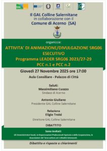 Il GAL Colline Salernitane in collaborazione con il Comune di Acerno organizza: ATTIVITA' DI ANIMAZIONE/DIVULGAZIONE SRG06 ESECUTIVO Programma LEADER SRG06 2023/27-29 PCC n 1 e PCC n 2.