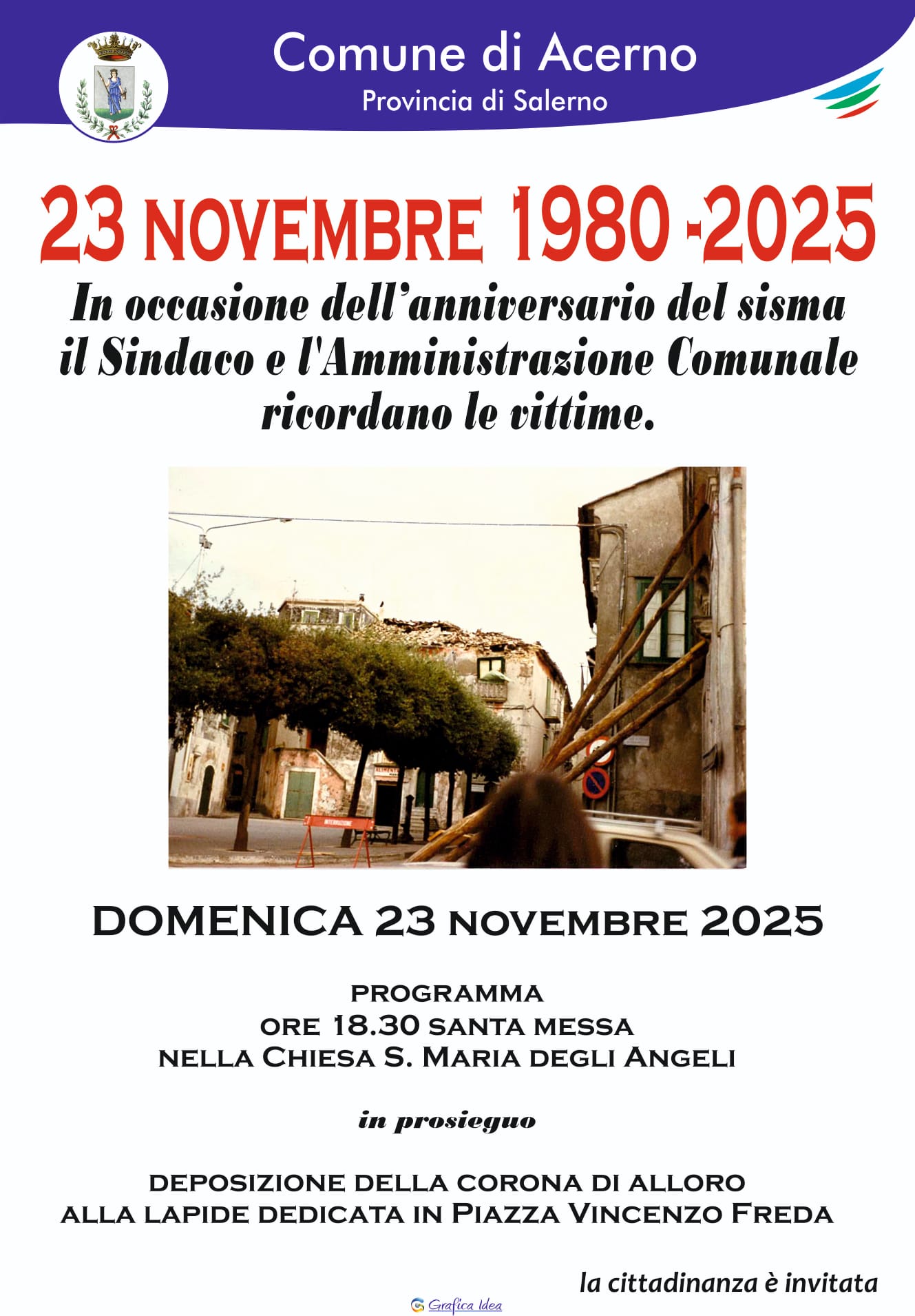 23 NOVEMBRE 1980 - 2025 In occasione dell'anniversario del sisma, il Sindaco e l'Amministrazione Comunale ricordano le vittime.