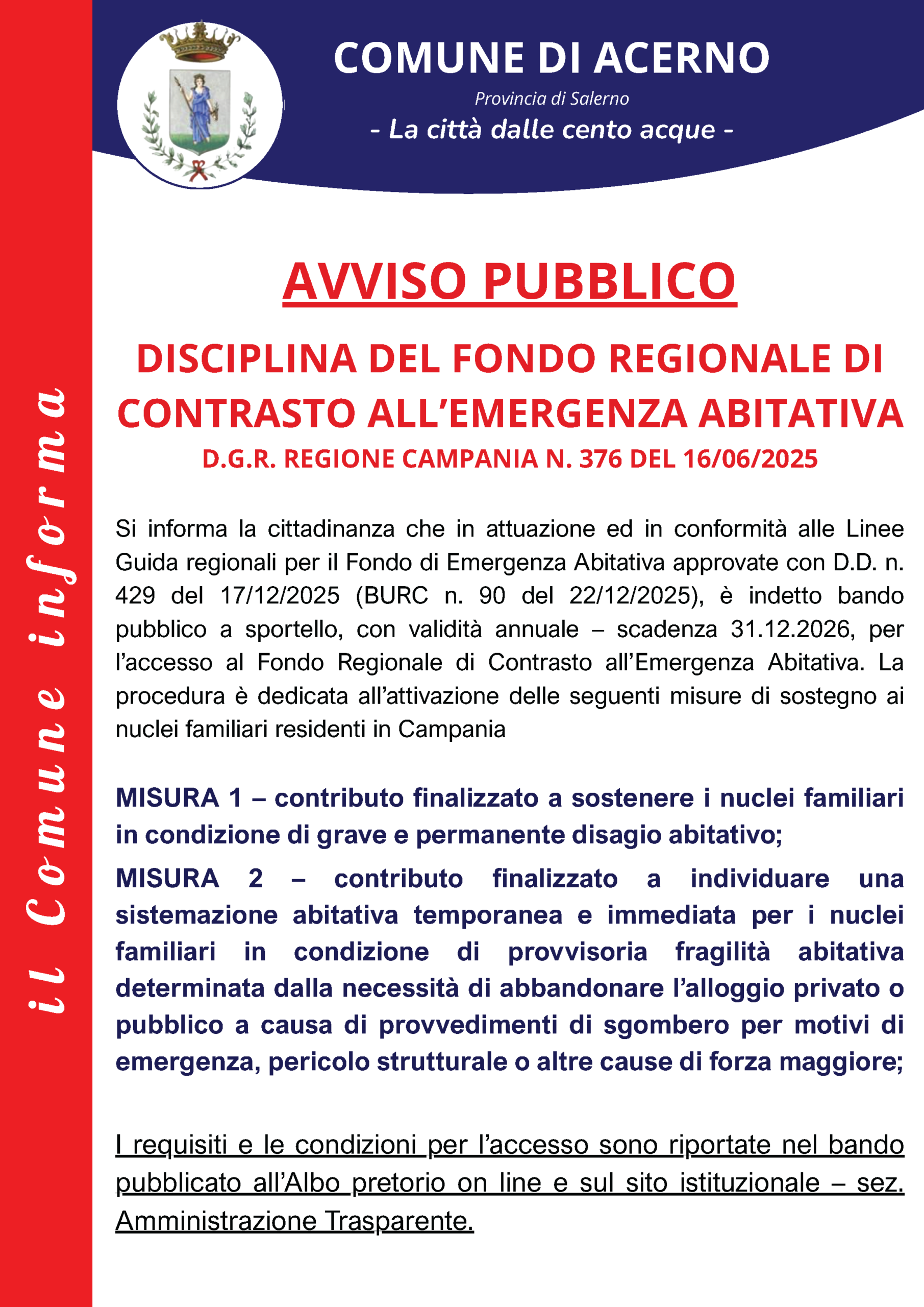 Si informa la cittadinanza che in attuazione ed in conformità alle Linee Guida regionali per il Fondo di Emergenza Abitativa approvate con D D n 429 del 17/12/2025 (BURC n 90 del 22/12/2025), è indetto bando pubblico a sportello, con validità annuale – scadenza 31/12/2026, per l’accesso al Fondo Regionale di Contrasto all’Emergenza Abitativa La procedura è dedicata all’attivazione delle seguenti misure di sostegno ai nuclei familiari residenti in Campania.