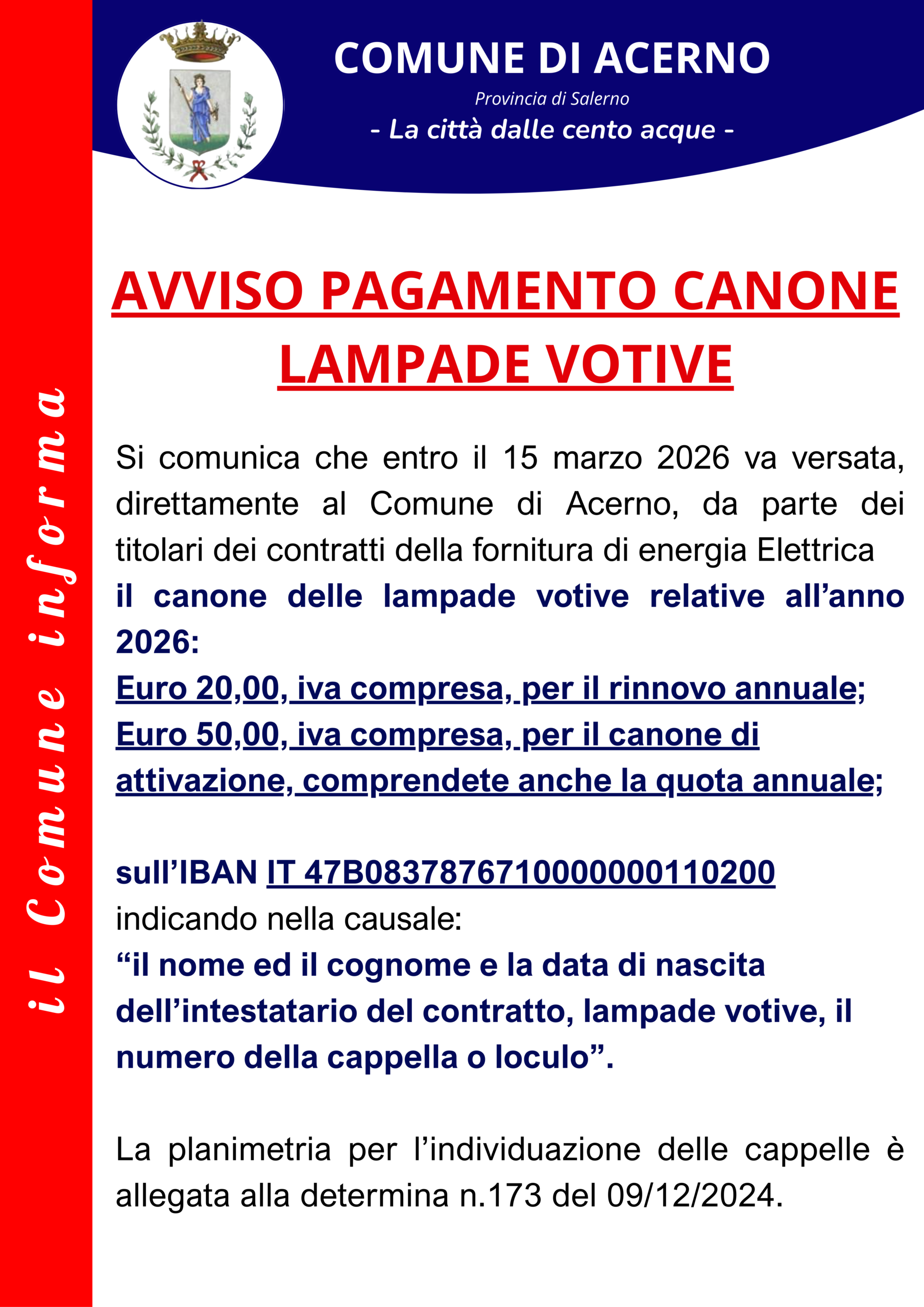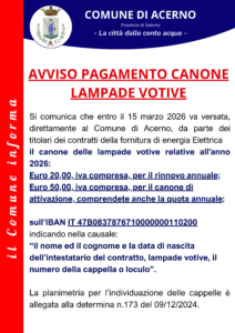 Si comunica che entro il 15 marzo 2026 va versata, direttamente al Comune di Acerno, da parte dei titolari dei contratti della fornitura di energia Elettrica il canone delle lampade votive relative all’anno 2026.