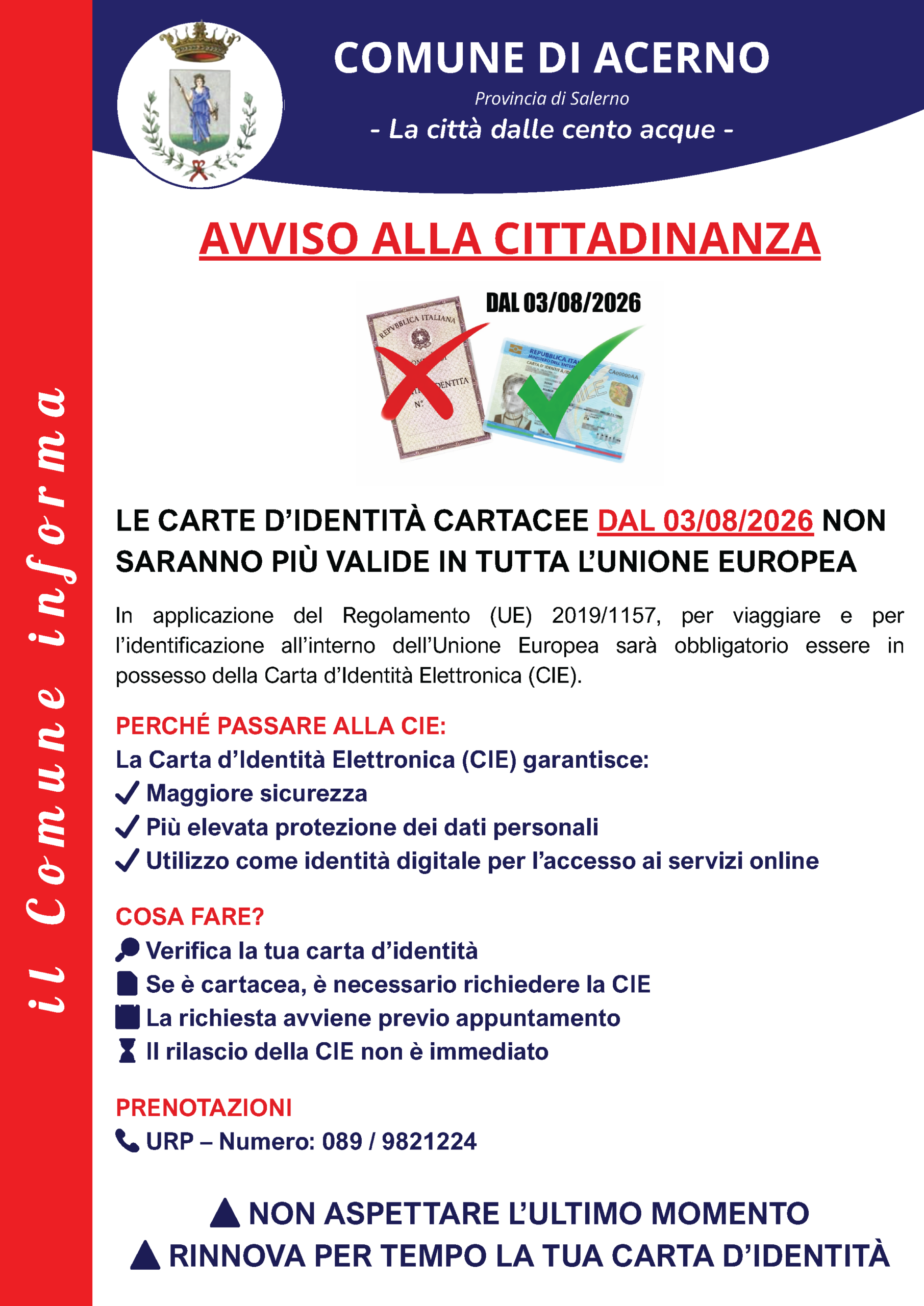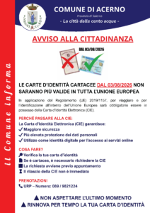 LE CARTE D’IDENTITÀ CARTACEE DAL 03/08/2026 NON SARANNO PIÙ VALIDE IN TUTTA L’UNIONE EUROPEA In applicazione del Regolamento (UE) 2019/1157, per viaggiare e per l’identificazione all’interno dell’Unione Europea sarà obbligatorio essere in possesso della Carta d’Identità Elettronica (CIE).