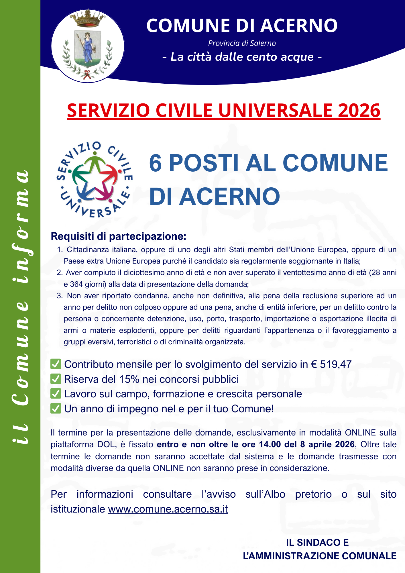 Per tutte le informazioni consultare il seguente avviso: SERVIZIO_CIVILE_2026